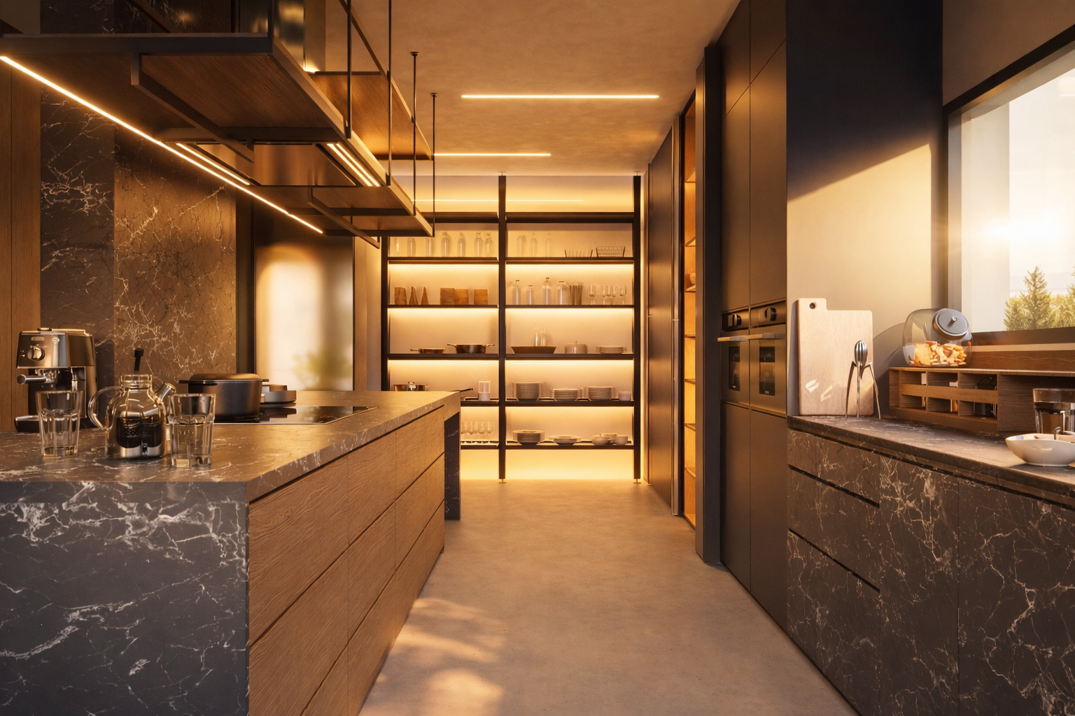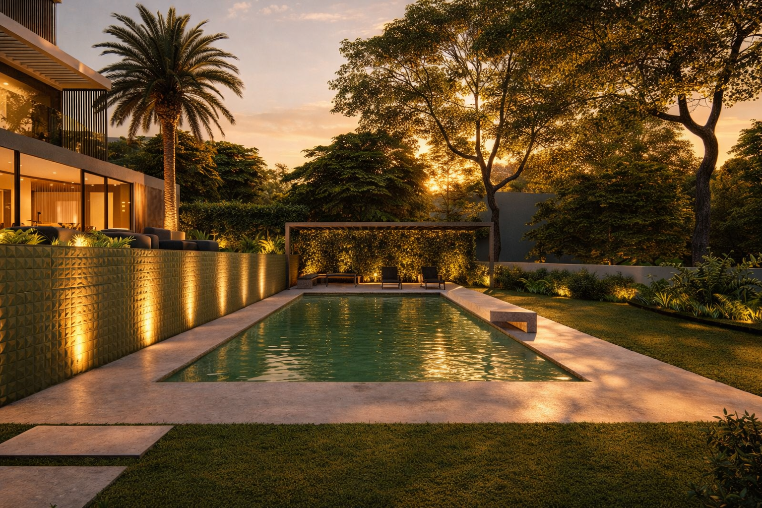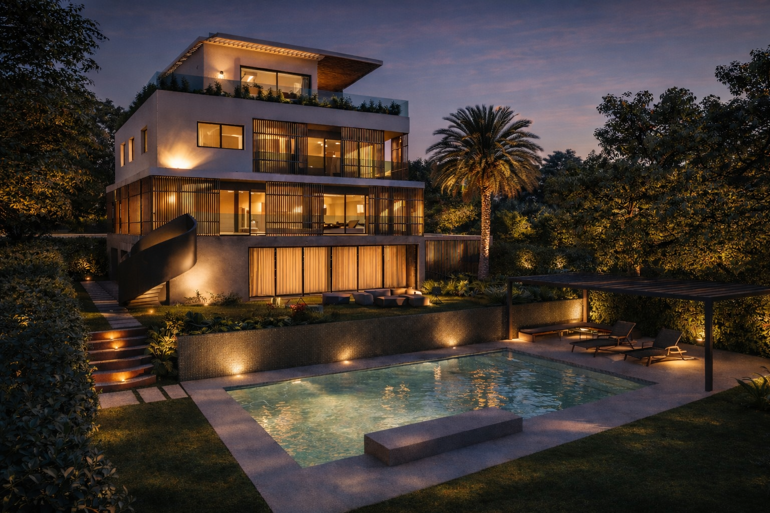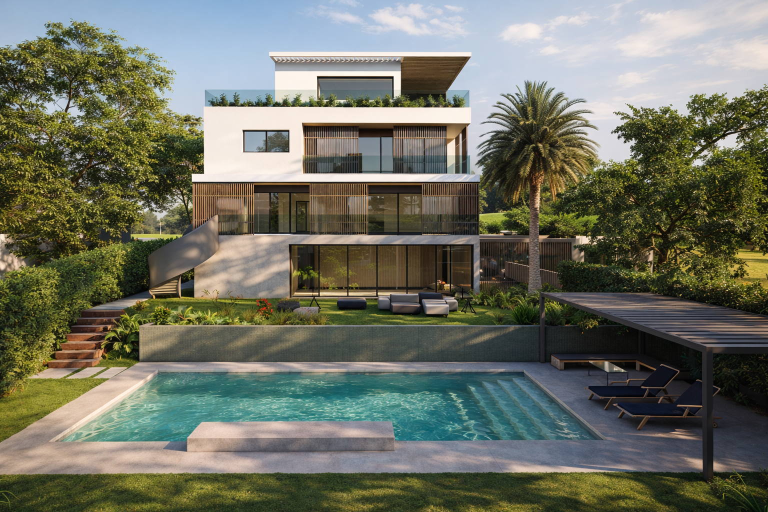 Due to the high level of sun exposure, the project also includes the installation of pergolas with adjustable louvres on the ground floor balconies and on the third floor, where the main suite’s balcony is located.The surrounding landscape will be completely redesigned to create pleasant and functional spaces. A standout feature is the wall that separates the swimming pool from the higher level where the house is situated, which will be clad in three-dimensional tiles.